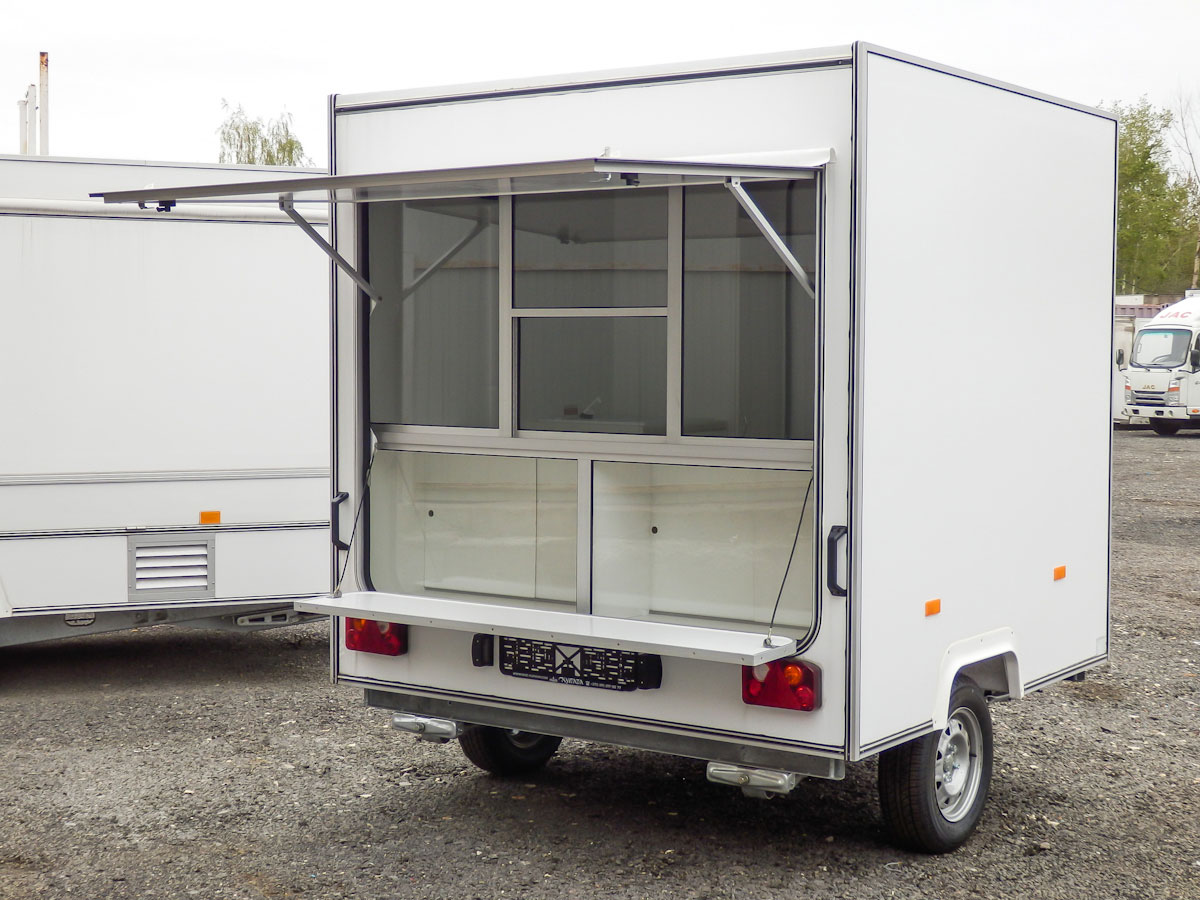 Торговый одноосный прицеп Купава, одна ставня в задней стенке с остеклением, стол-прилавок.
