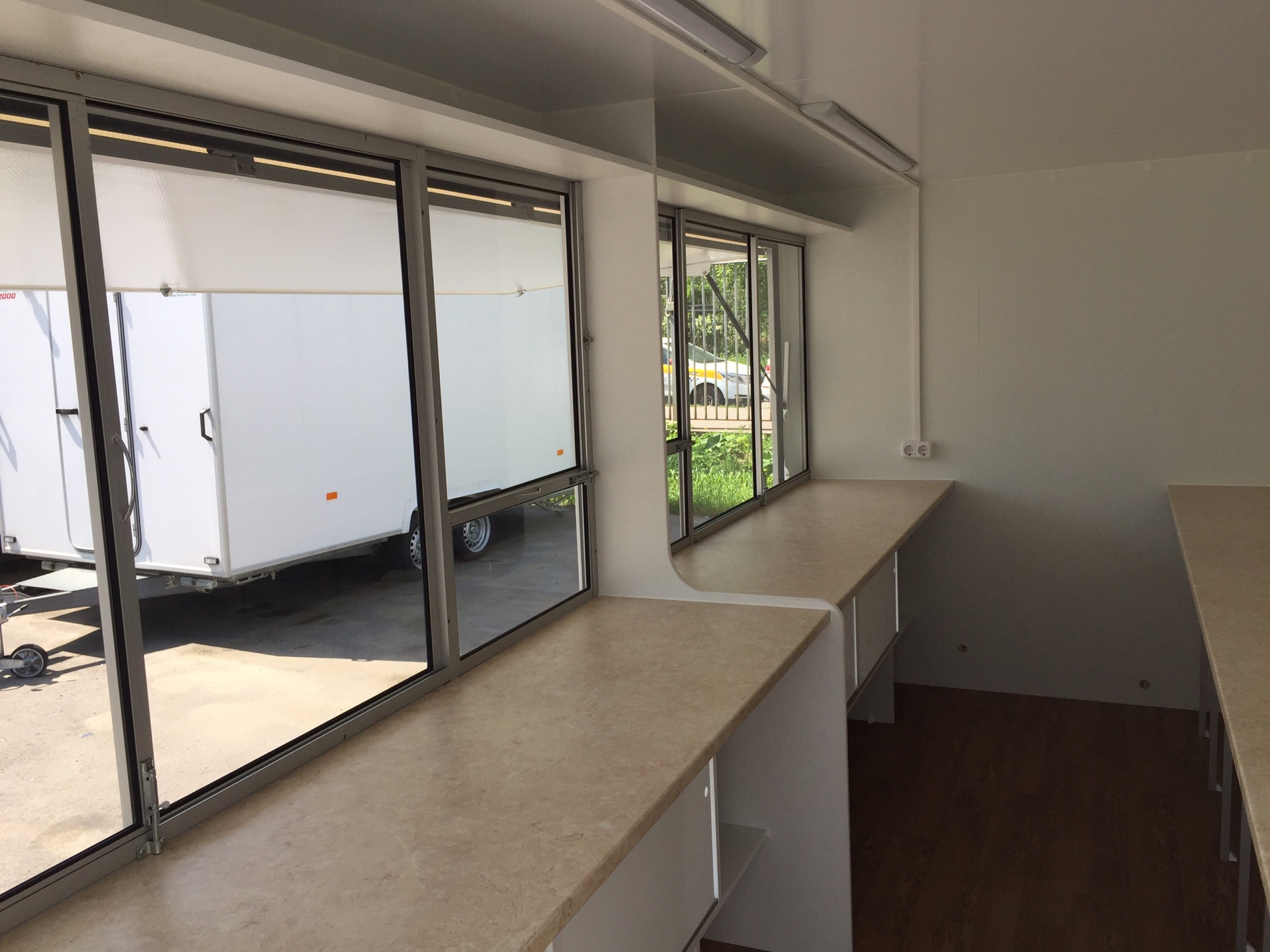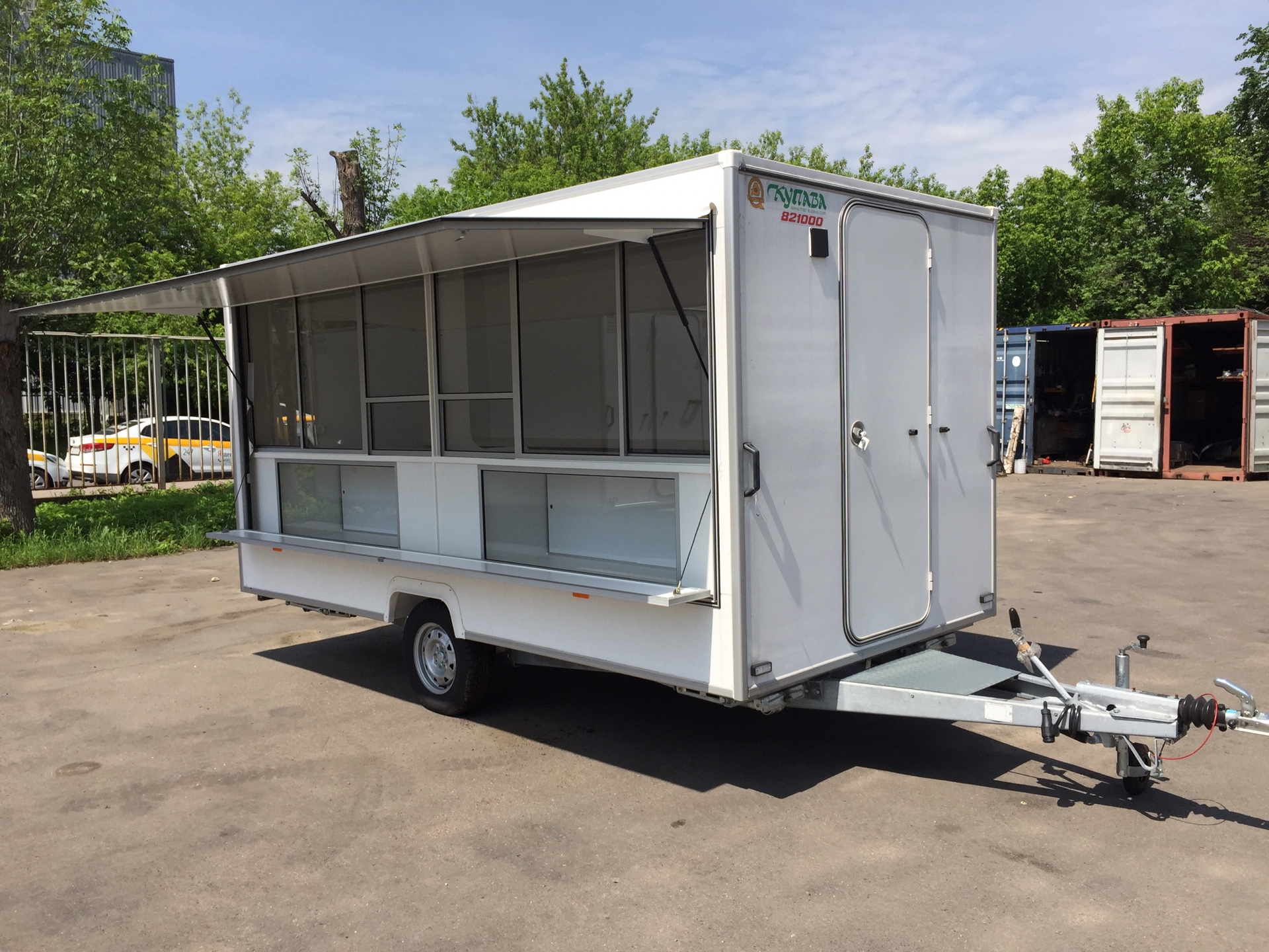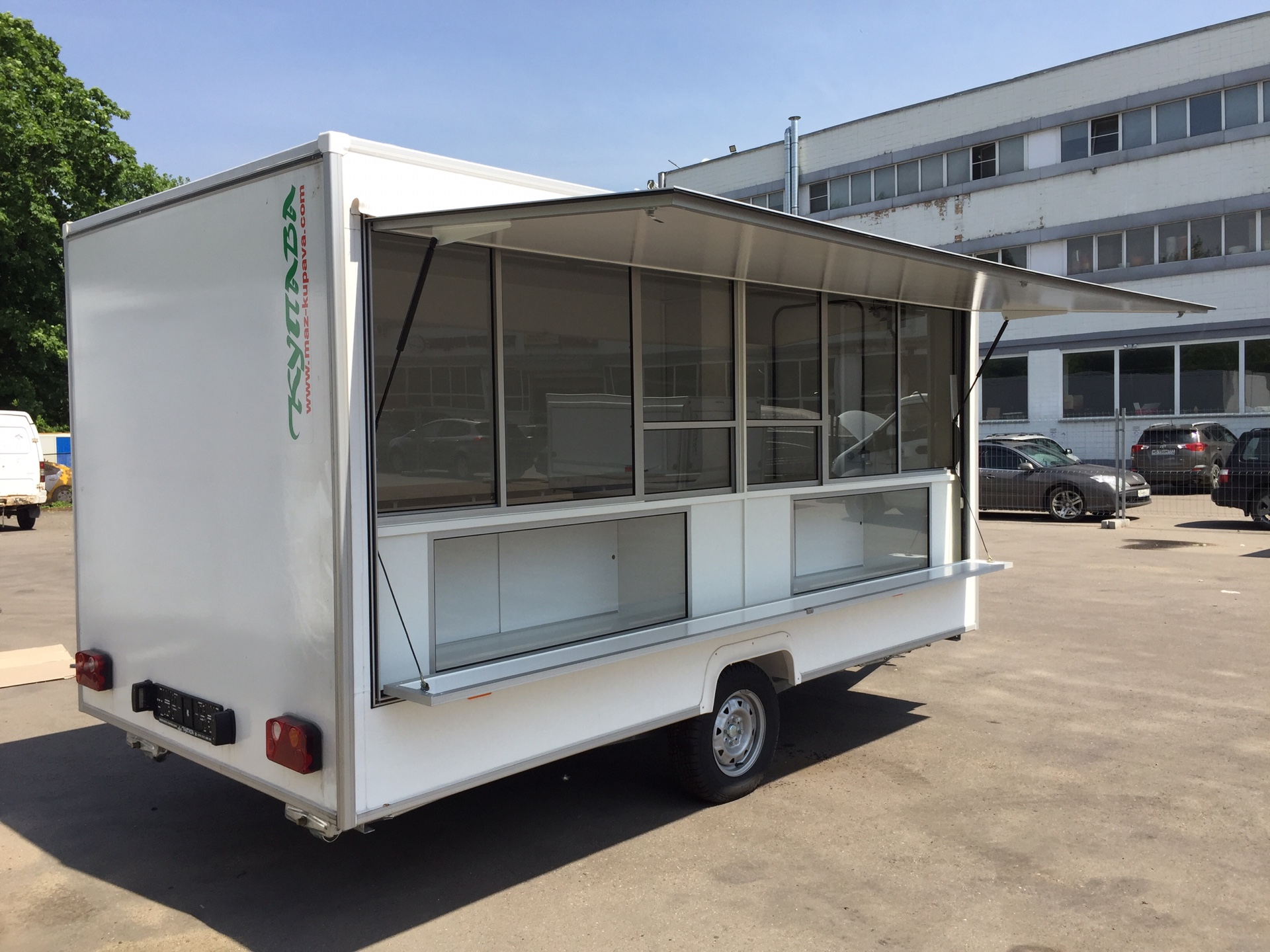 Прицеп длинной 3.9м, Два рабочих места, два окна выдачи. Грузоподъемностью до 120 кг. Большой и вместительный.