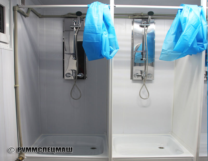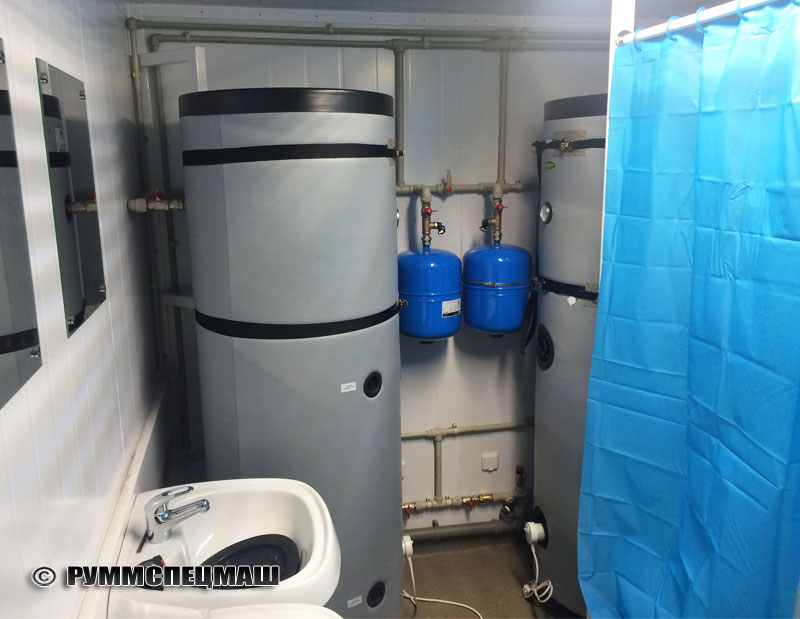 От других блоков душевую отличает большая теплоизоляция и материалы устойчивые к влаге. Могут использовать автономное водоснабжение и центральное. Подогрев воды осуществляется в накопительных баках 100 л.