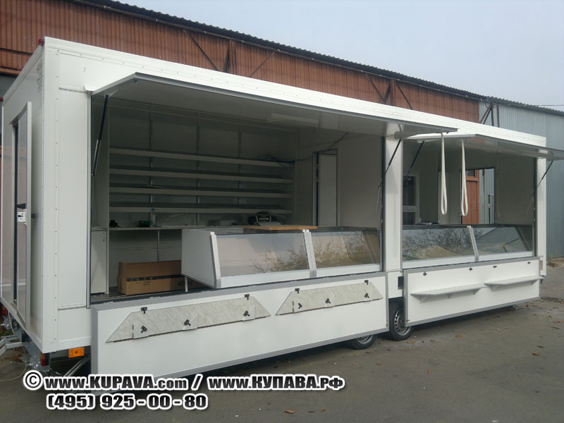 Торговый двухосный прицеп тонар Купава, две ставни с остеклением, мебель из ламинированной дсп.