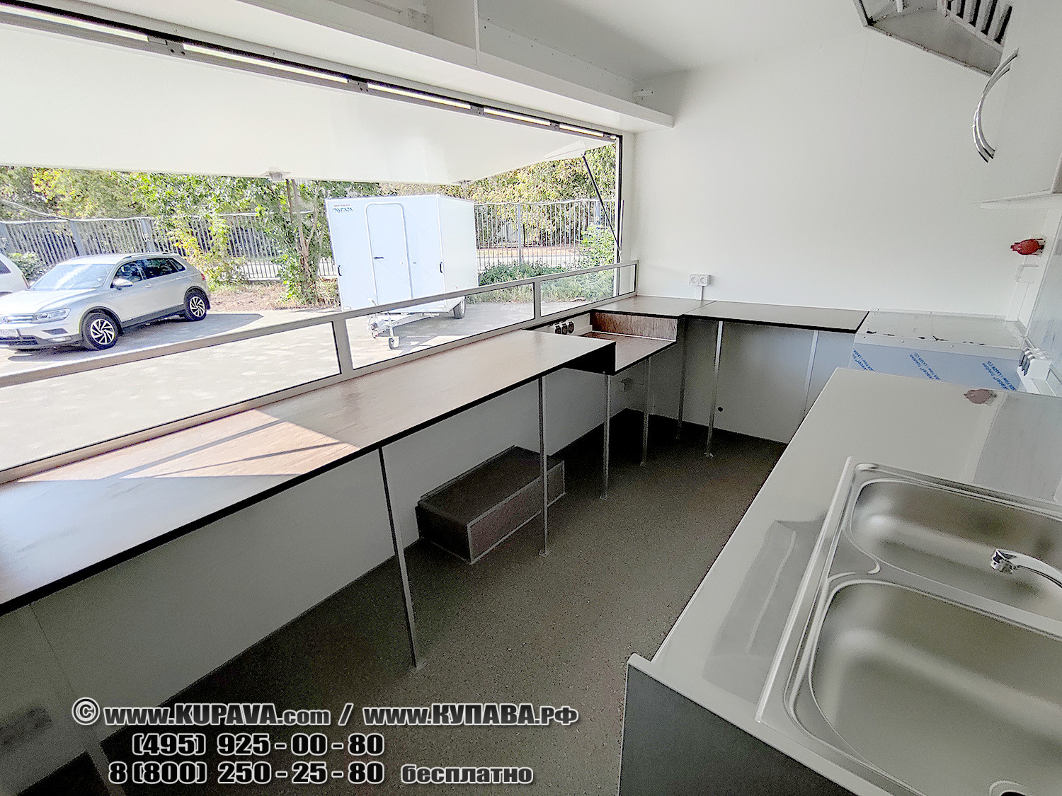 - автономное водоснабжение (система под давлением, тумба с двойной раковиной из нержавеющей стали, погружной насос, смеситель, две канистры, блок питания 12В, бойлер)
