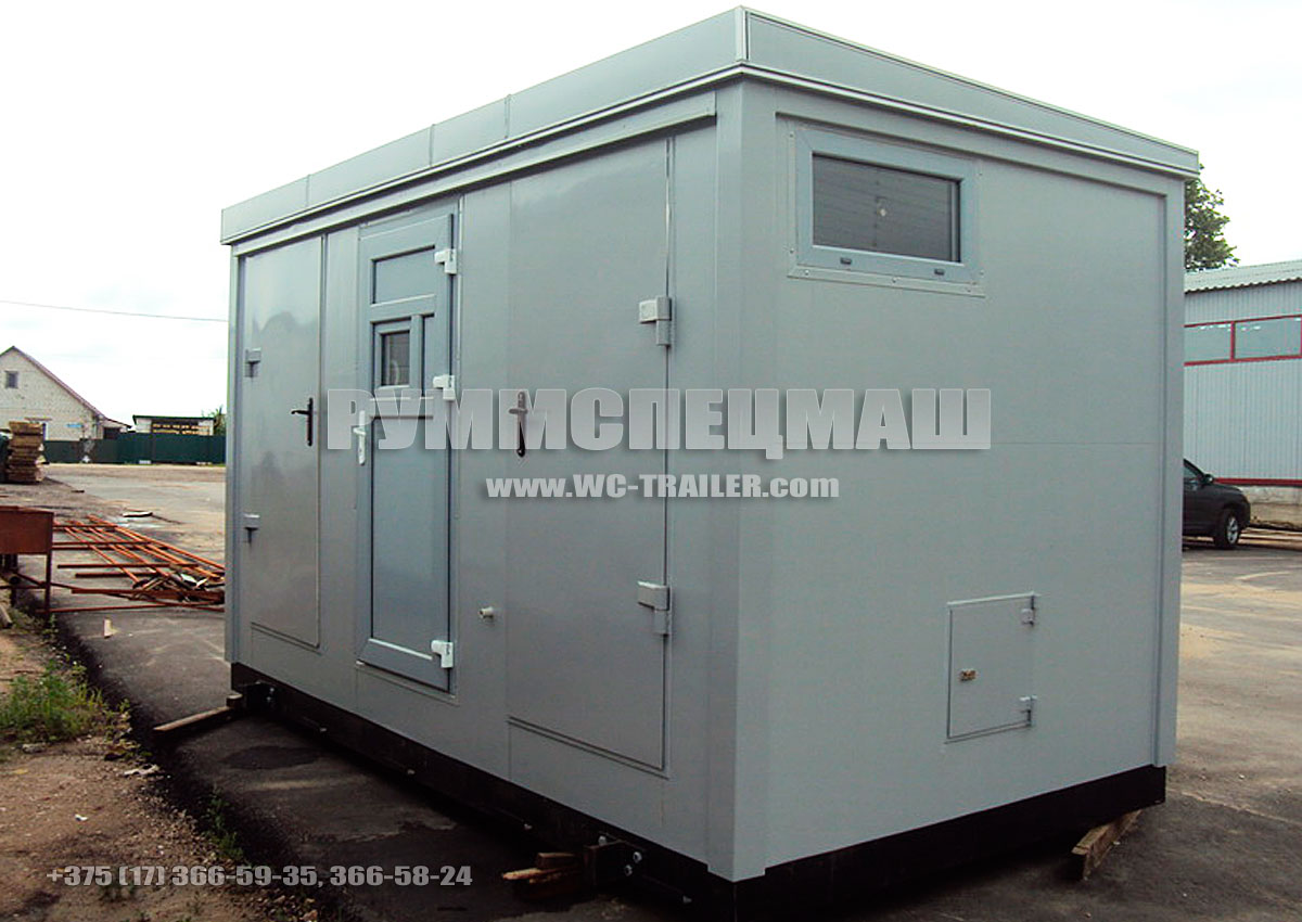 Базовая комплектация: тип корпуса КУТ: стены-крыша-дверь – клееная сандвич панель металлопласт-пенополистирол- металлопласт, 44 мм., пол – ПУР- заливка, окантовка- специальный алюминиевый профиль, два окна ПВХ, элекроввод, щиток без счетчика, автомат, УЗО, выключатель, розетка, три светильника, три электроконвектора, по два унитаза, умывальника и вентилятора, один писсуар, отделение кассира с гардеробным шкафом и шкафом для инвентаря.
