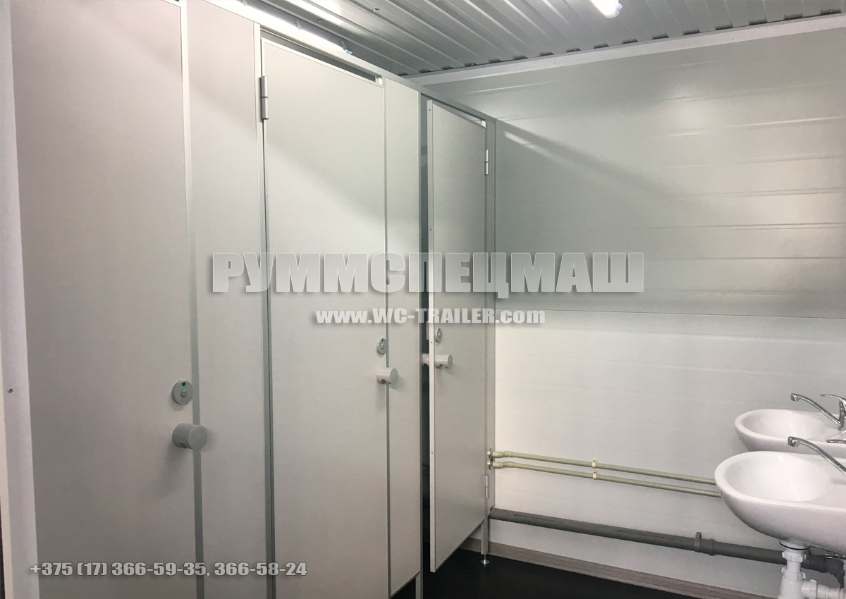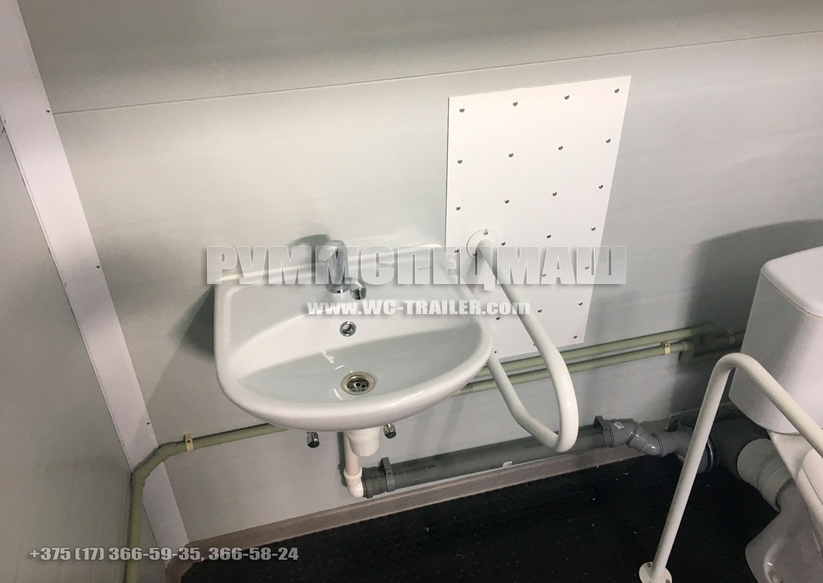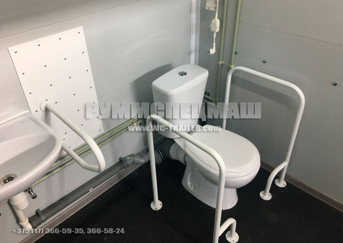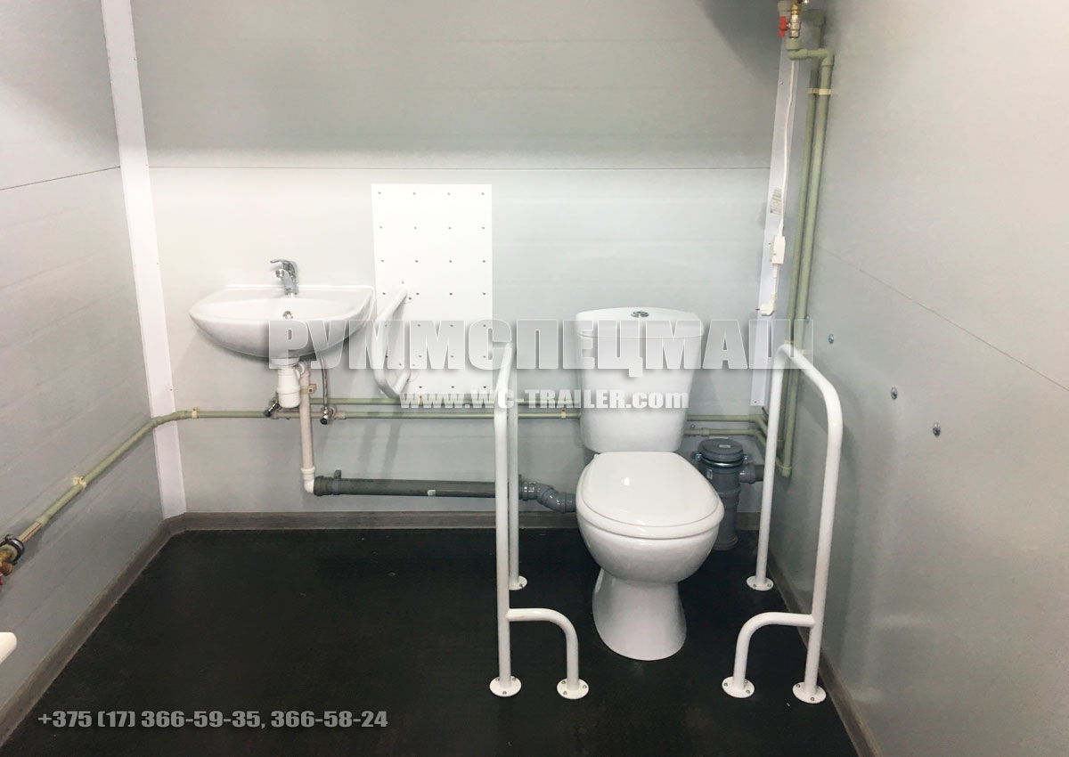 Туалет из блок-контейнера с санитартым помещением для людей-инвалидов выполнен из гидроизоляционных материалов. Конструкция предполагает проведение воды, канализационных труб, электроснабжения. Тщательная изоляция проводки исключает возможность короткого замыкания. Для больших помещений можно соединить несколько строительных модулей.