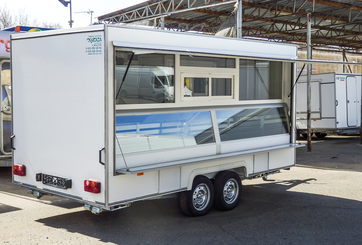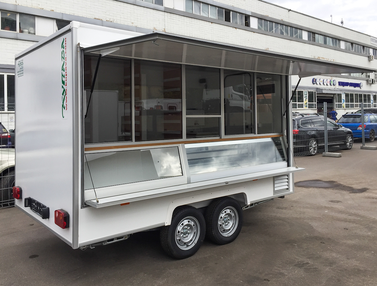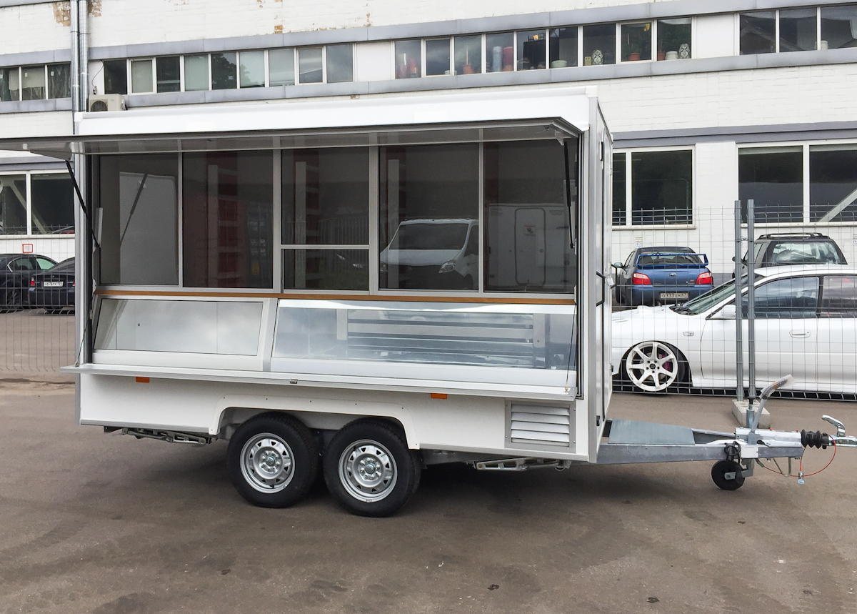 Прицеп длинной 3.2м. Установлены две специальные холодильные витрины на 320л, морозильный ларь 400л, кондиционер оконного типа, солнце-защита на ставню.
