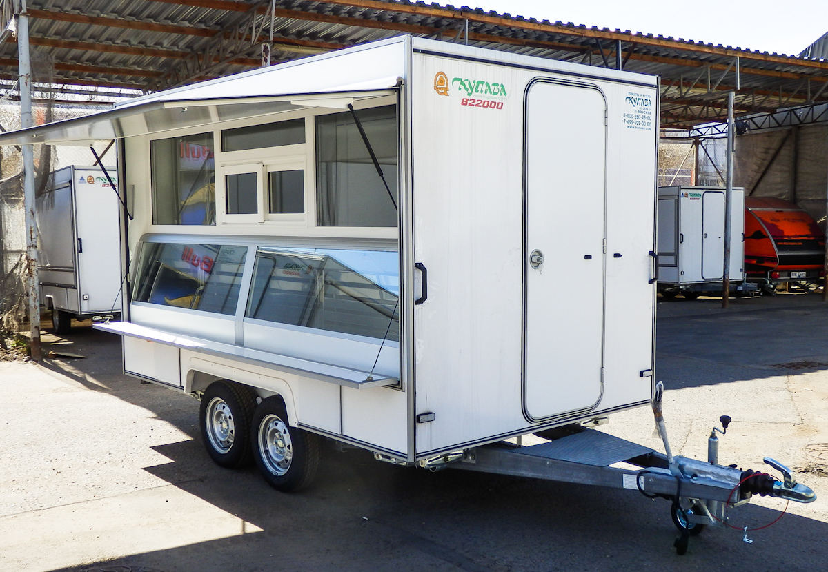 Прицеп длинной 3.2м, одно рабочее место. Грузоподъемностью до 500 кг. Возможны варианты исполнения прицепа высотой 1,9 и 2,3 м. Автоприцеп торговый Купава 813230 базовая комплектация Торговый двухосный прицеп тонар Купава, одна ставня с остеклением, мебель из...