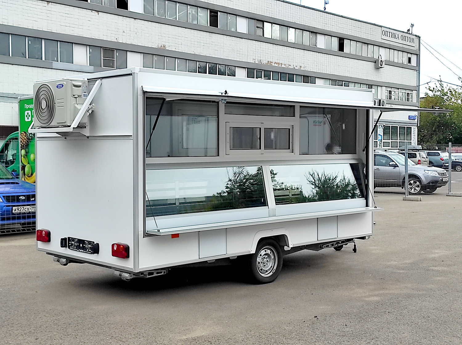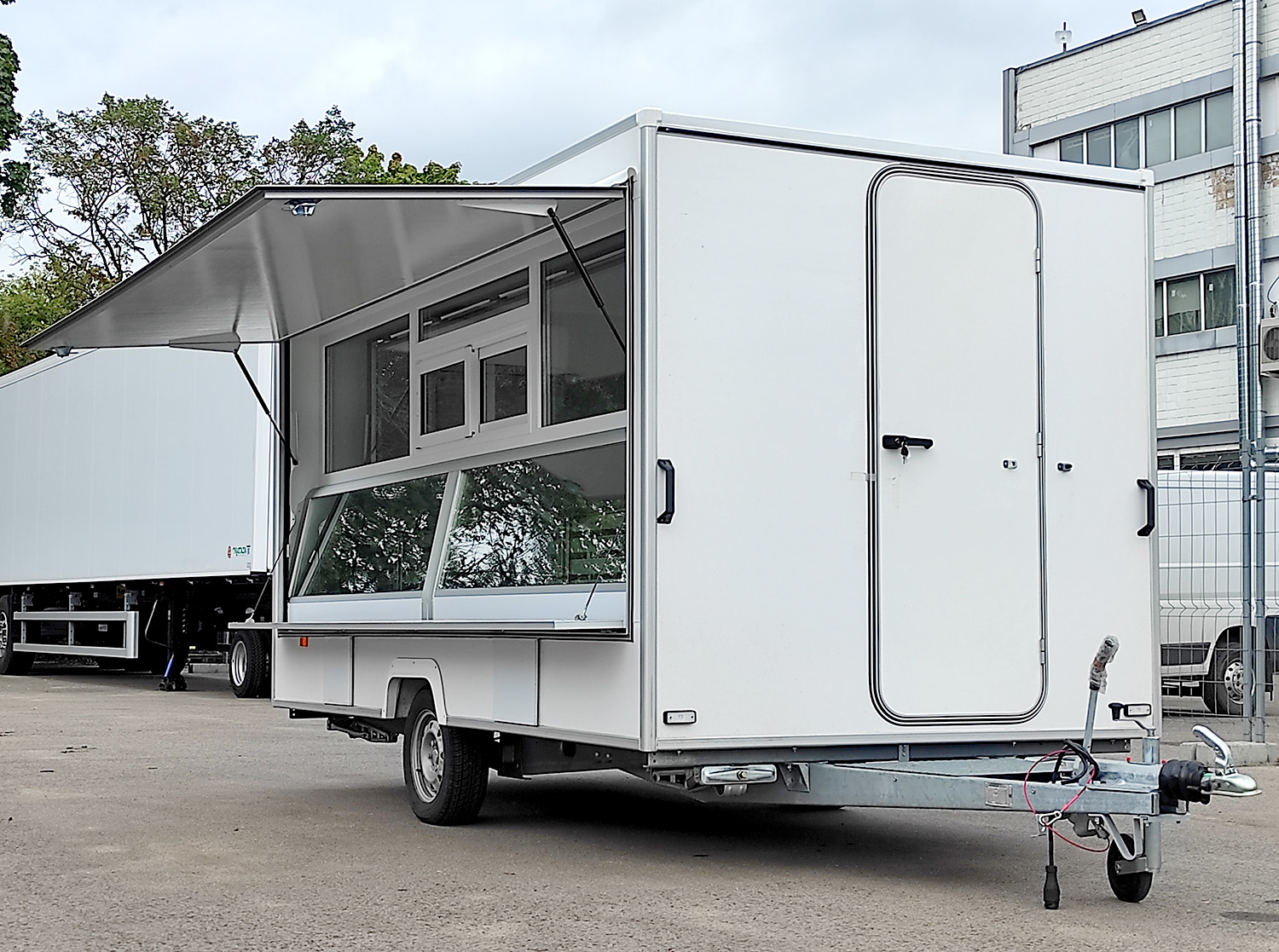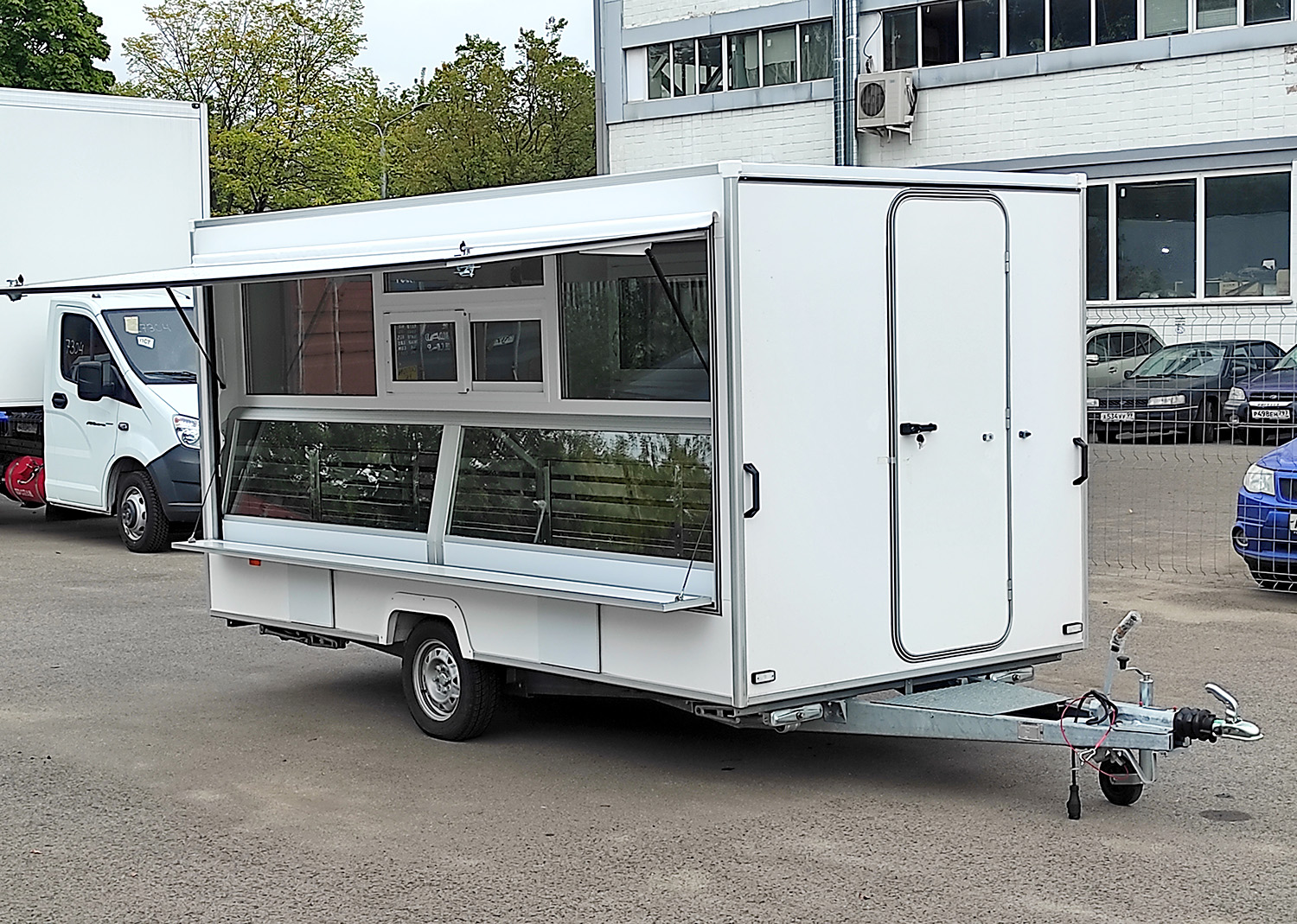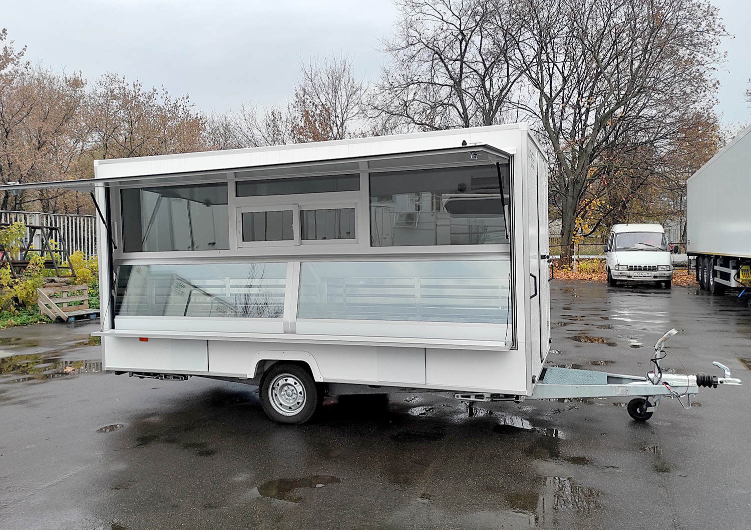 Прицеп длинной 3.9м, Два рабочих места, два окна выдачи. Грузоподъемностью до 120 кг. Большой и вместительный. Автоприцеп торговый Купава 813230 базовая комплектация Торговый одноосный прицеп тонар Купава, одна ставня с остеклением, мебель из ламинированной...