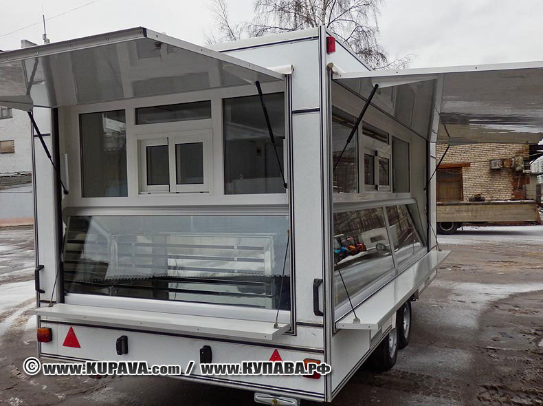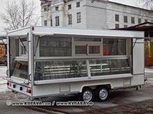 Прицеп длинной 4.4м. Грузоподъемностью до 550 кг. Спец.версия с морозильными витринами (-6…+6С) и солнцезащитой для комфортной работы холодильных витрин.