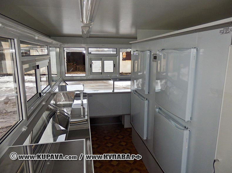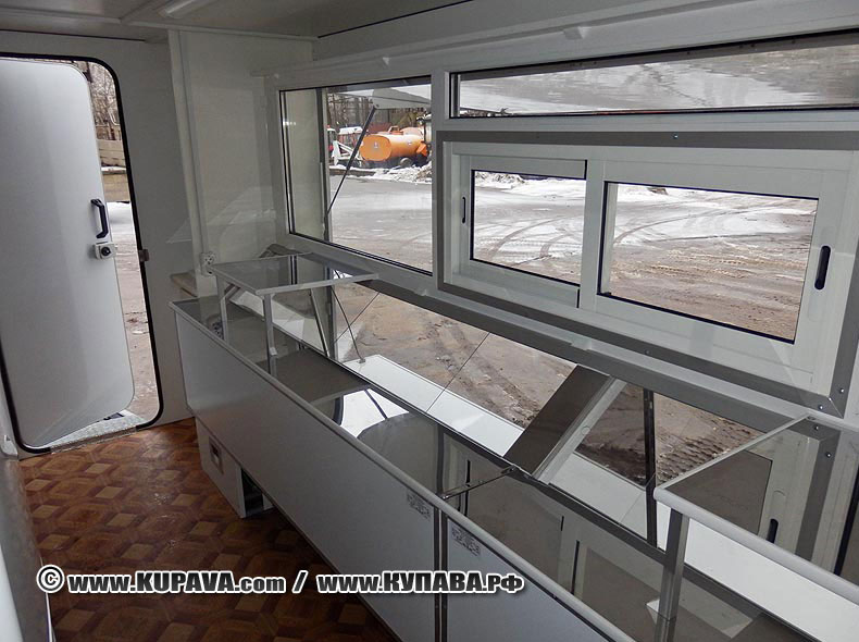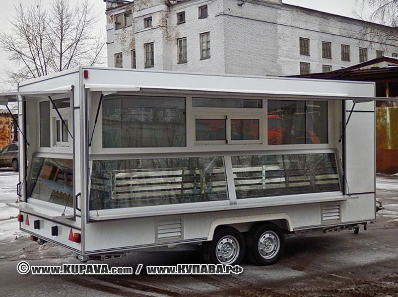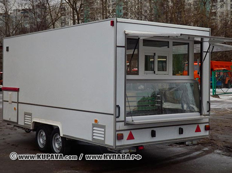 Прицеп длинной 4.4м, Два рабочих места. Грузоподъемностью до 500 кг. Усиленное шасси. Для торговли охлажденной и замороженной продукцией. Автоприцеп торговый Купава 813290 базовая комплектация Торговый одноосный прицеп тонар Купава, одна ставня с остеклением, мебель...