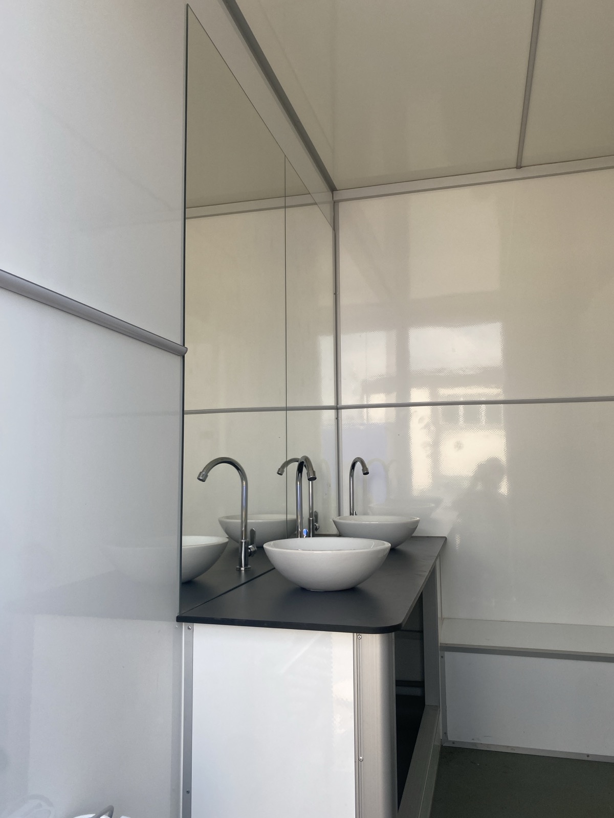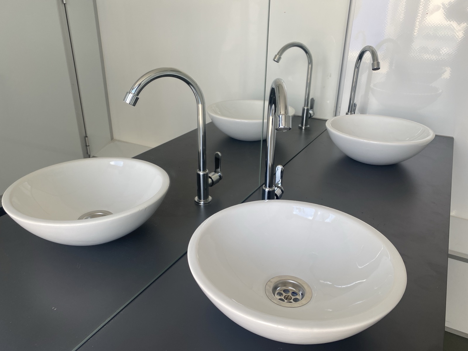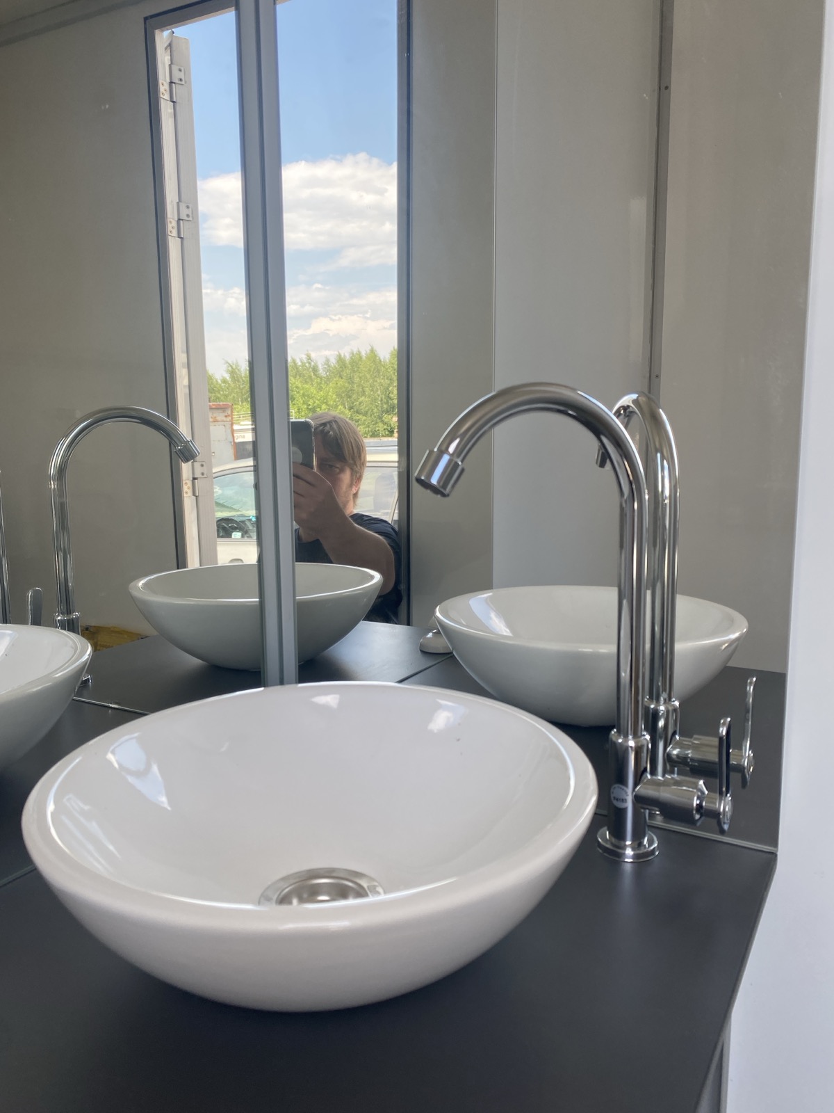 Перегородки между кабинками из сэндвич панелей. Двери открываются наружу. Тумбы под раковины из сэндвич панелей.