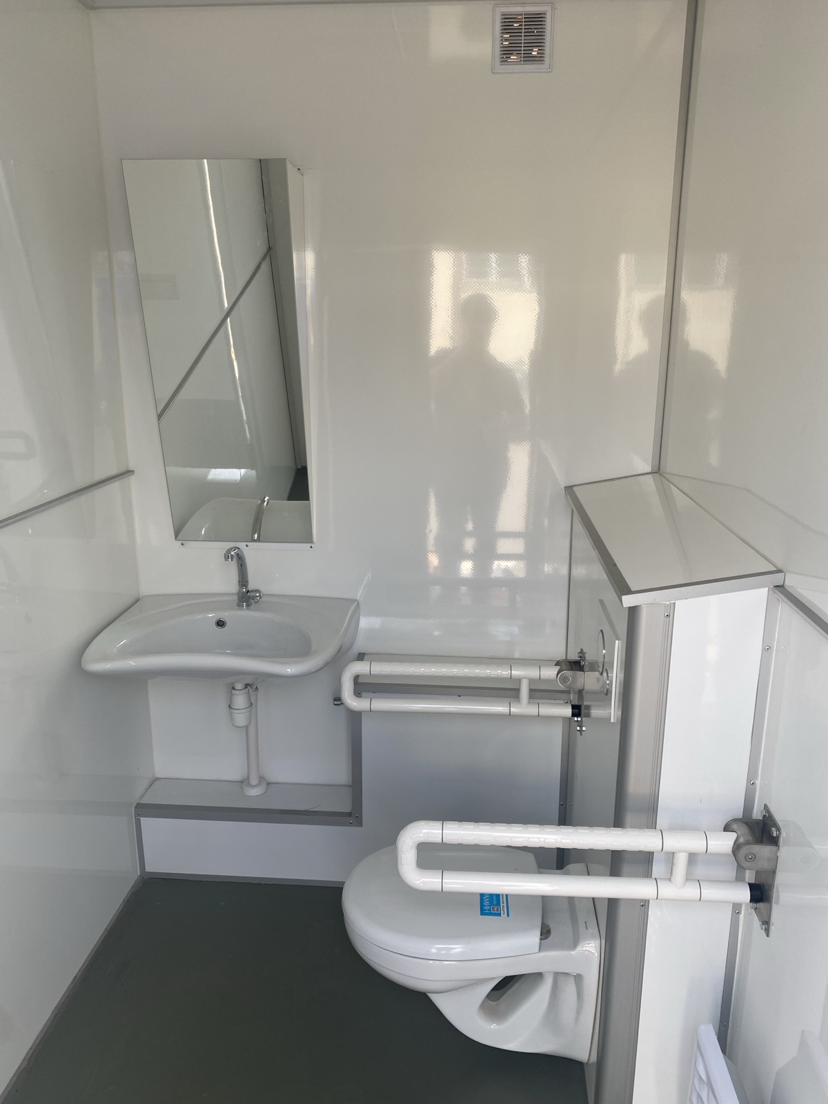 c. Инвалиды: 1 унитаз, 1 умывальник, 1 зеркало, 1 обогреватель, нерж. поручень пристенный, нерж. поручень складной, пандус для въезда складной, дверь внутренняя, 1 слив в полу