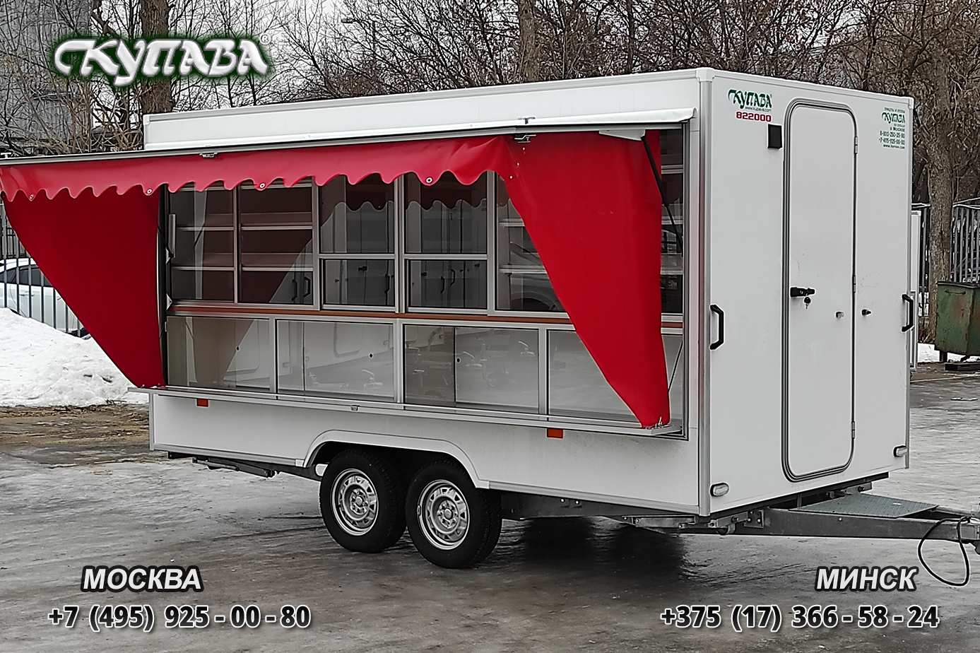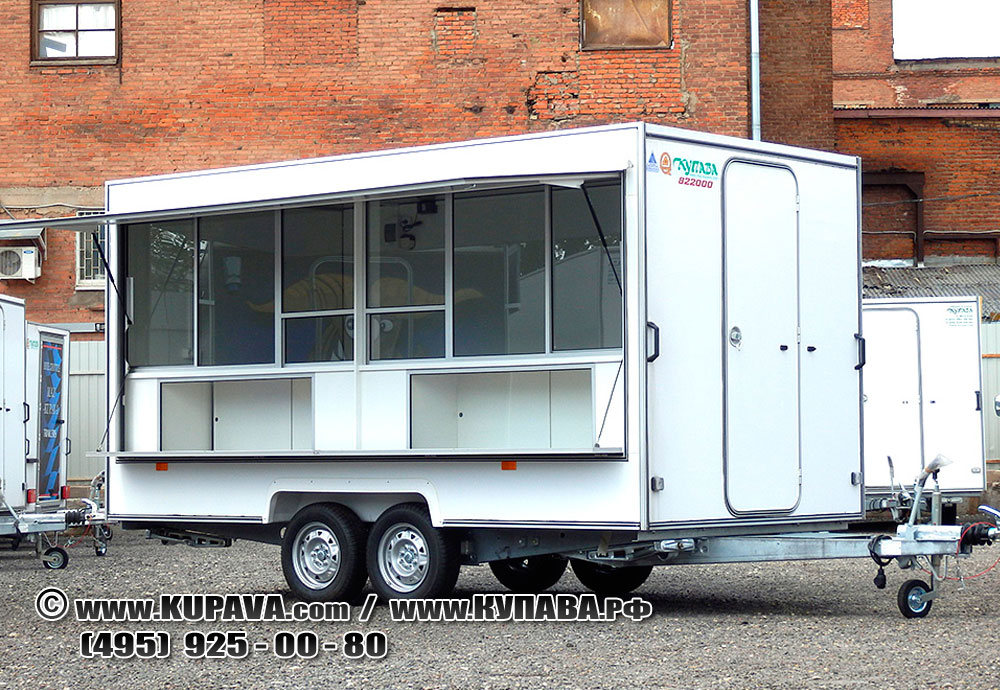 Прицеп длинной 3.9м, два рабочих места. Грузоподъемностью до 500 кг. Одна или две холодильные витрины по 350л, холодильный шкаф до 1250л. Морозильный ларь до 600л.